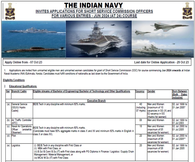नौसेना के एग्जीक्यूटिव ब्रांच में जनरल सर्विस, एयर ट्रैफिक कंट्रोलर, नेवल एयर ऑपरेशंस ऑफिसर और पायलट SSC ऑफिसर एवं लॉजिस्टिक्स SSC ऑफिसर भर्ती के लिए उम्मीदवारों को बीई/बीटेक उत्तीर्ण होना चाहिए और जन्म 2 जुलाई 1999 से पहले व 1 जनवरी 2005 के बाद नहीं हुआ होना चाहिए। हालांकि, एटीसी के लिए उम्मीदवार का जन्म 1 जुलाई 2003 के बाद नहीं हुआ होना चाहिए। अन्य पदों के लिए अधिसूचना देखें।