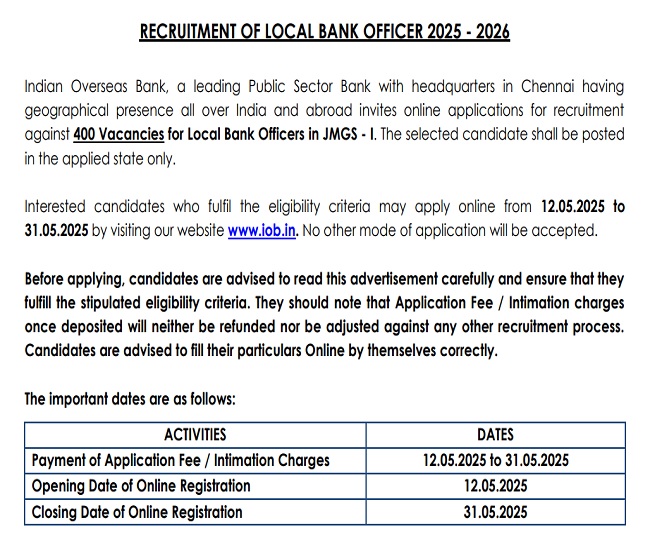 जॉब डेस्क, नई दिल्ली। बैंक में सरकारी नौकरी करने का सपना देख रहे युवाओं के लिए बड़ी खबर है। इंडियन ओवरसीज बैंक की ओर से लोकल बैंक ऑफिसर के 400 रिक्त पदों पर भर्ती निकाली गई है। इस भर्ती के लिए आवेदन प्रक्रिया आज यानी 12 मई से शुरू हो गई है जो निर्धारित अंतिम तिथि 31 मई 2025 तक जारी रहेगी।