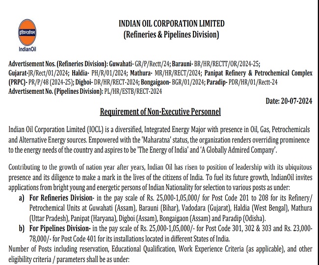 IOCL Recruitment 2024: इंडियन ऑयल में नॉन एग्जीक्यूटिव के 467 पदों पर एप्लीकेशन स्टार्ट, 21 अगस्त तक फॉर्म भरने का मौका