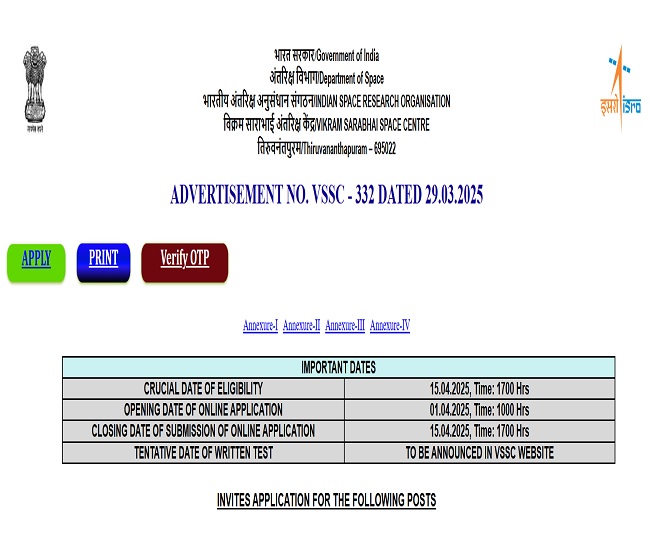 जॉब डेस्क, नई दिल्ली। भारतीय अंतरिक्ष अनुसंधान संगठन (इसरो) के विक्रम साराभाई अंतरिक्ष अनुसंधान संगठन (वीएसएससी) में विभिन्न पदों पर भर्ती निकाली गई शामिल होने के लिए आवेदन की लास्ट डेट 15 अप्रैल 2025 निर्धारित है। ऐसे में जो अभ्यर्थी इस भर्ती के लिए पात्रता पूरी करते हैं और सरकारी नौकरी पाना चाहते हैं वे तय तिथियों के अंदर ऑनलाइन माध्यम से ऑफिशियल वेबसाइट www.vssc.gov.in पर जाकर फॉर्म भर सकते हैं। इसके अलावा आप इस पेज पर दिए गए डायरेक्ट लिंक पर क्लिक करके भी आवेदन प्रक्रिया पूर्ण कर सकते हैं।