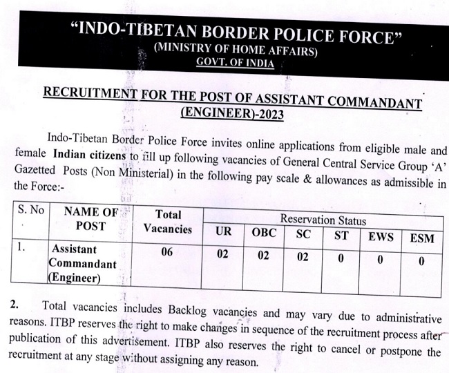 ITBP AC Recruitment 2023: आईटीबीपी असिस्टेंट कमांडेंट भर्ती के लिए नोटिफिकेशन जारी, 16 नवंबर से कर सकेंगे आवेदन