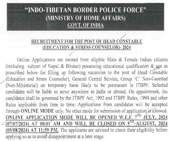 ITBP Recruitment 2024: आईटीबीपी में हेड कॉन्स्टेबल एजुकेशन एन्ड स्ट्रेस काउंसलर पदों पर शुरू हुए आवेदन, ये रही भर्ती डिटेल