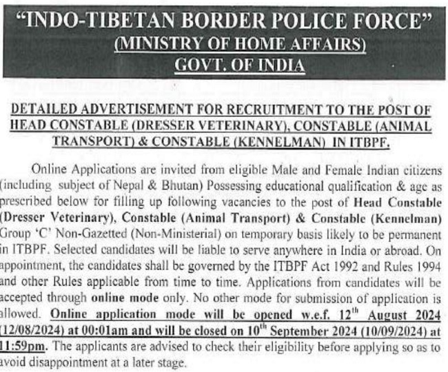 जॉब डेस्क, नई दिल्ली। इंडो तिब्बती बॉर्डर पुलिस (ITBP) में सरकारी नौकरी पाकर देश सेवा की चाह रखने वाले युवाओं के लिए खुशखबरी है। आईटीबीपी की ओर से कॉन्स्टेबल, हेड कॉन्स्टेबल के अंतर्गत विभिन्न पदों पर भर्ती के लिए नोटिफिकेशन जारी की गई है। अधिसूचना के मुताबिक इस भर्ती के लिए आवेदन प्रक्रिया आज यानी 12 अगस्त 2024 से शुरू हो जाएगी।