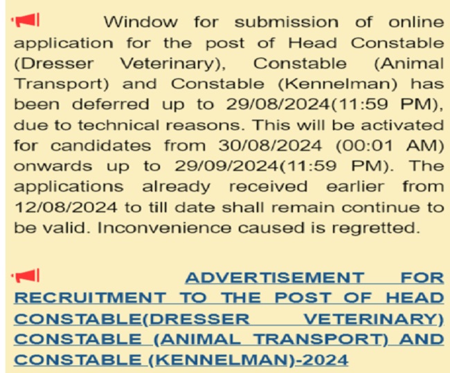 इस भर्ती के माध्यम से कॉन्स्टेबल एवं हेड कॉन्स्टेबल के कुल 128 रिक्त पदों पर नियुक्तियां की जाएंगी। इसमें से हेड कॉन्स्टेबल ड्रेसर वेटरिनरी (मेल/ फीमेल) के लिए 9 पद, कॉन्स्टेबल एनिमल ट्रांसपोर्ट (मेल/ फीमेल) के लिए 115 पद और कॉन्स्टेबल केनेलमैन (ओनली मेल) के लिए 4 पद आरक्षित हैं। भर्ती से जुड़ी विस्तृत डिटेल के लिए अभ्यर्थी ऑफिशियल वेबसाइट पर विजिट कर सकते हैं।