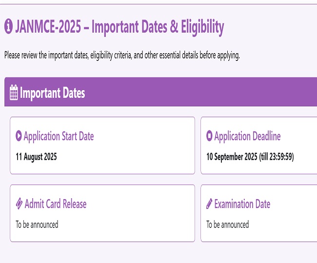 एजुकेशन डेस्क, नई दिल्ली। झारखंड कर्मचारी चयन आयोग (JSSC) की ओर से एएनएम प्रतियोगिता परीक्षा (JANMCE 2025) के लिए नोटिफिकेशन जारी कर आवेदन प्रक्रिया स्टार्ट कर दी गई है। जो भी अभ्यर्थी इस भर्ती के लिए पात्रता पूरी करते हैं वे इसमें शामिल होने के लिए जेएसएससी की ऑफिशियल वेबसाइट jssc.jharkhand.gov.in पर जाकर फॉर्म भर सकते हैं। आवेदन की लास्ट डेट 10 सितंबर 2025 तय की गई है।