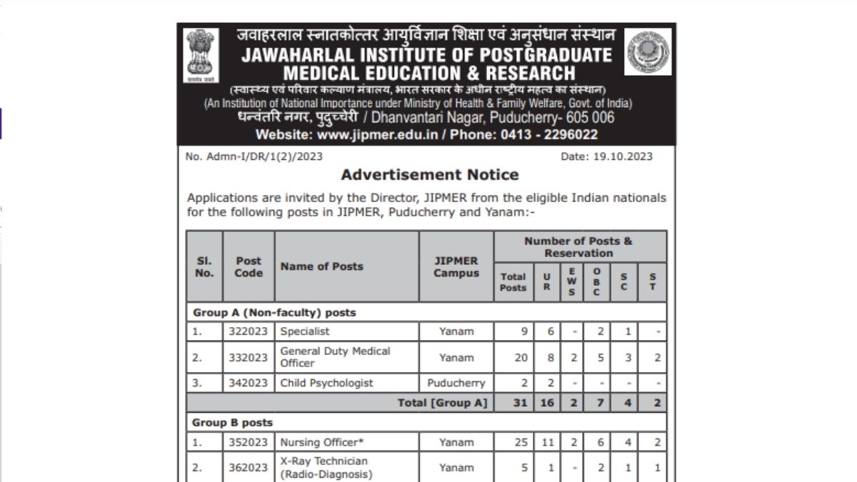 JIPMER Recruitment 2023: यहां गुप A, B और C के पदों पर निकली भर्ती, 16 नवंबर तक करें अप्लाई