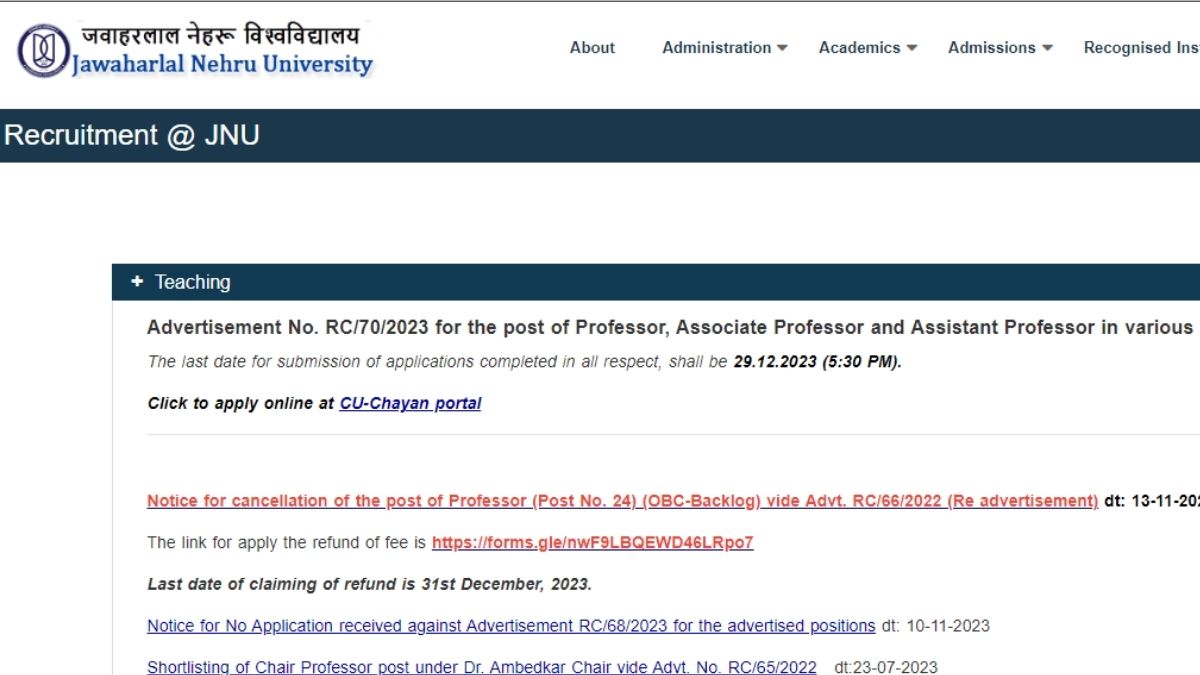 JNU Recruitment 2023: जवाहरलाल नेहरू यूनिवर्सिटी ने फैकल्टी के पदों पर निकाली भर्ती, 29 दिसंबर तक करें आवेदन