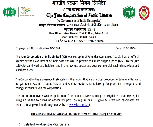 भारतीय जूट निगम लिमिटेड में जूनियर इंस्पेक्टर, असिस्टेंट समेत अन्य पदों पर आवेदन का मौका, 12वीं से लेकर डिग्रीधारक कर सकते हैं अप्लाई