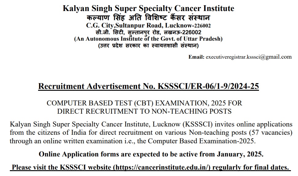 जॉब डेस्क, नई दिल्ली। उत्तर प्रदेश सरकार के अंतर्गत आने वाले स्वायत्तशासी संस्थान कल्याण सिंह सुपर स्पेशलिटी कैंसर संस्थान में नॉन टीचिंग पदों पर भर्ती निकाली गई है। इस भर्ती के लिए आवेदन प्रक्रिया 2 जनवरी से शुरू की गई थी एवं फॉर्म भरने की लास्ट डेट 31 जनवरी 2025 तय की गई है। ऐसे में जो भी अभ्यर्थी इस भर्ती में शामिल होना चाहते हैं वे जल्द से जल्द ऑनलाइन माध्यम से फॉर्म भर सकते हैं।