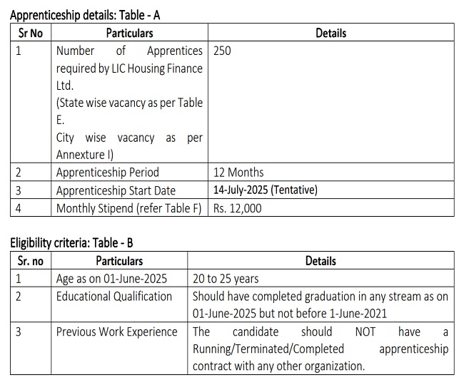 एलआईसी एचएफएल अप्रेंटिसशिप भर्ती में आवेदन के लिए अभ्यर्थी का किसी भी मान्यता प्राप्त यूनिवर्सिटी/ संस्थान से किसी भी स्ट्रीम में ग्रेजुएशन उत्तीर्ण होना अनिवार्य है। इसके साथ ही अभ्यर्थी की न्यूनतम आयु 20 साल से कम और अधिकतम आयु 25 साल से ज्यादा नहीं होनी चाहिए। हालांकि, आरक्षित श्रेणी से आने वाले अभ्यर्थियों को ऊपरी आयु में नियमानुसार छूट दी जाएगी। उम्र की गणना 1 जून 2025 को ध्यान में रखकर होगी।