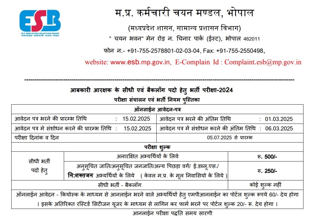 जॉब डेस्क, नई दिल्ली। मध्य प्रदेश कर्मचारी चयन बोर्ड (MPPEB) की ओर से आबकारी विभाग, मध्यप्रदेश के अन्तर्गत आबकारी आरक्षक पदों की सीधी एवं बैकलॉग भर्ती परीक्षा-2024 के लिए आवेदन प्रक्रिया 15 फरवरी से स्टार्ट कर दी गई है। जो भी अभ्यर्थी पुलिस विभाग में सरकारी नौकरी पाना चाहते हैं वे इस भर्ती में भाग लेने के लिए ऑनलाइन माध्यम से ऑफिशियल वेबसाइट esb.mp.gov.in पर जाकर फॉर्म भर सकते हैं। आवेदन करने की लास्ट डेट 1 मार्च 2025 निर्धारित है। ऑनलाइन आवेदन करने से पहले उम्मीदवार एक बार पात्रता की जांच अवश्य कर लें।