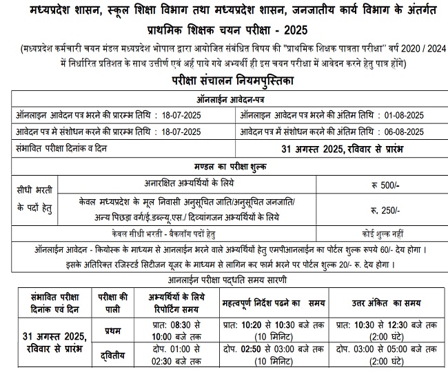 जॉब डेस्क, नई दिल्ली। टीचर बनने का सपना देख रहे युवाओं के लिए बड़ी खबर है। मध्य प्रदेश चयन मंडल, भोपाल की ओर से जनजातीय कार्य विभाग के अंतर्गत प्राइमरी टीचर के 10150 पदों पर भर्ती के लिए नोटिफिकेशन जारी किया गया है। अधिसूचना के मुताबिक इस भर्ती के लिए ऑनलाइन आवेदन प्रक्रिया 18 जुलाई 2025 से स्टार्ट की जाएगी जो निर्धारित अंतिम तिथि 1 अगस्त 2025 तक जारी रहेगी। जो भी उम्मीदवार इस भर्ती के लिए पात्रता पूरी करते हैं वे ऑनलाइन माध्यम से MPESB की ऑफिशियल वेबसाइट esb.mp.gov.in पर जाकर आवेदन प्रक्रिया पूर्ण कर सकेंगे।