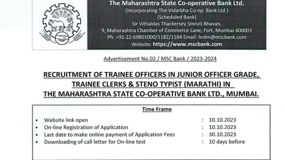 जॉब डेस्क, नई दिल्ली। MSC Bank Recruitment 2023: महाराष्ट्र स्टेट कॉपरेटिव बैंक लिमिटेड ने विभिन्न पदों पर भर्ती निकाली है। इनमें ट्रेनी जूनियर ऑफिसर, ट्रेनी क्लर्क और स्टेनो टाइपिस्ट (मराठी) के पद शामिल हैं। इन पदों को भरने के लिए बैंक ने आधिकारिक वेबसाइट https://www.mscbank.com पर एक आधिकारिक नोटिफिकेशन भी जारी किया है। इन पदों पर भर्ती के लिए आवेदन करने के इच्छुक और योग्य उम्मीदवार ऑफिशियल वेबसाइट पर जाकर अप्लाई कर सकते हैं।