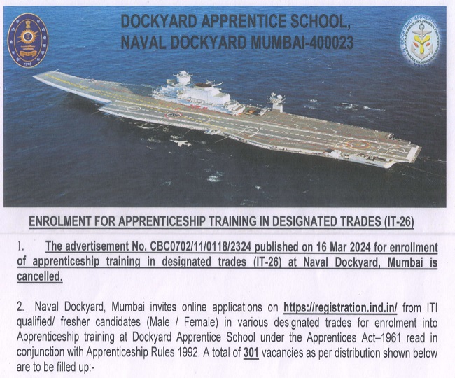 नवल डॉकयार्ड मुंबई की ओर से 301 रिक्त पदों को भरने के लिए भर्ती निकाली गई है। इस भर्ती के लिए ऑनलाइन आवेदन प्रक्रिया 23 अप्रैल से शुरू हो गई है जो 10 मई 2024 तक जारी रहेगी। जो भी अभ्यर्थी 8वीं/ मैट्रिक/ आईटीआई/ एसएससी उत्तीर्ण हैं वे बिना देरी करते हुए इस भर्ती में आवेदन कर सकते हैं। फॉर्म ऑफिशियल वेबसाइट registration.ind.in पर जाकर भरा जा सकता है।