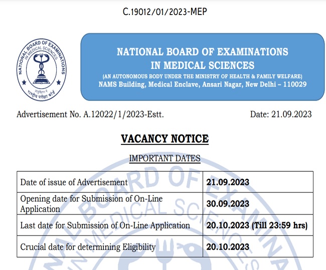 NBEMS Recruitment 2023: आयुर्विज्ञान में राष्ट्रीय परीक्षा बोर्ड में 48 पदों के लिए आवेदन 30 सितंबर से