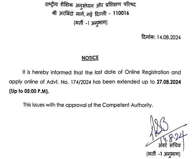 एनसीईआरटी में प्रोफेसर असिस्टेंट प्रोफेसर एसोसिएट प्रोफेसर भर्ती के लिए एप्लीकेशन फॉर्म भरने की लास्ट डेट को 27 अगस्त 2024 सायं 5 बजे तक एक्सटेंड कर दिया गया है। ऐसे में जो अभ्यर्थी तय तिथियों में आवेदन नहीं कर सके थे और इस भर्ती के लिए पात्रता पूरी करते हैं वे अब बढ़ाई गई तिथि तक आवेदन प्रक्रिया पूर्ण कर लें। फॉर्म भरने से पहले पात्रता की जांच कर लें।