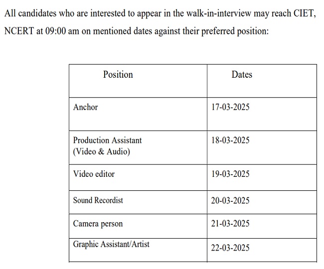 वॉक इन इंटरव्यू में शामिल होने के लिए अभ्यर्थियों को CIET, NCERT के निर्धारित पते पर सुबह 9 बजे सभी आवश्यक दस्तावेजों के साथ उपस्थिति दर्ज करवानी होगी। पदानुसार वॉक इंटरव्यू डेट्स की जानकारी निम्नलिखित है-