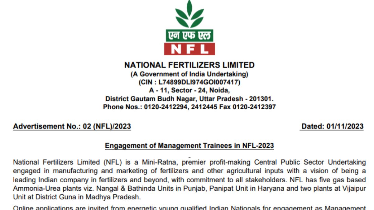NFL Recruitment 2023: नेशनल फर्टिलाइजर्स लिमिटेड ने मैनेजमेंट ट्रेनी के पदों पर निकाली भर्ती, जानें सब अपडेट