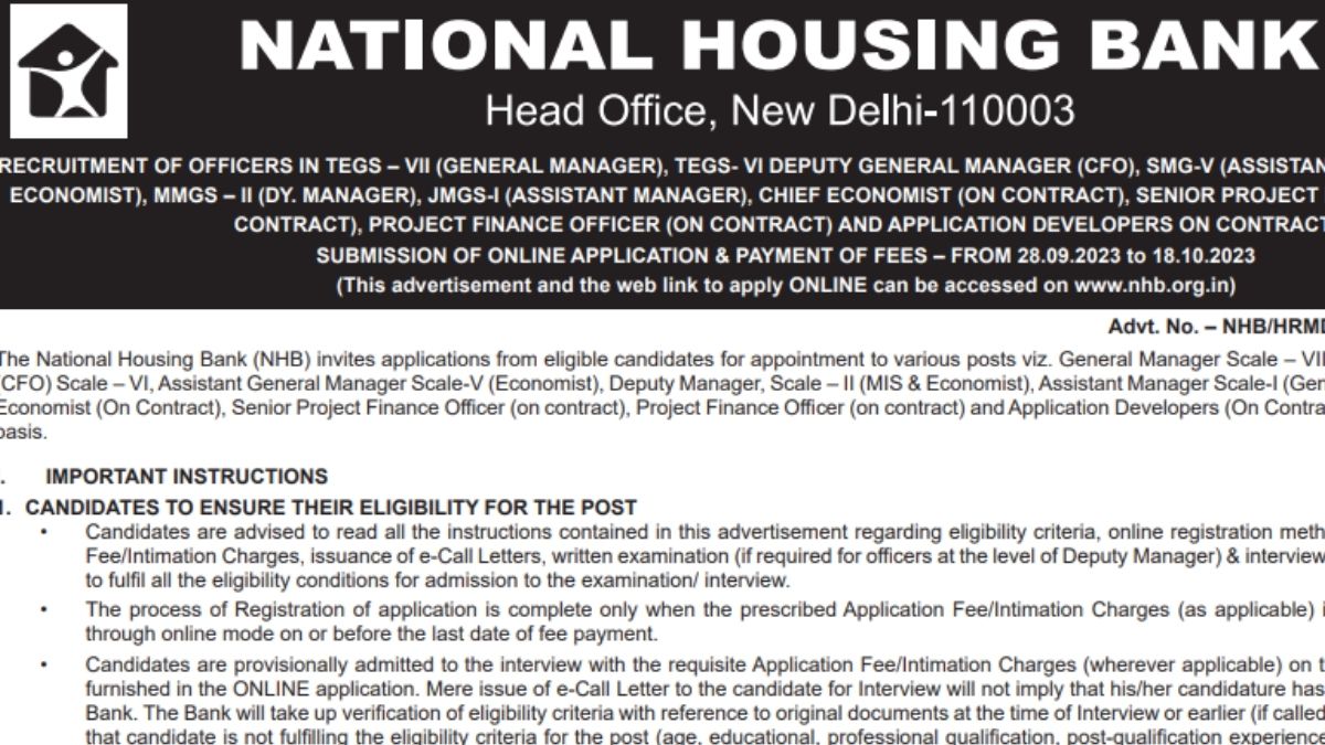 NHB Recruitment 2023: नेशनल हाउसिंग बैंक 59 साल वालों को दे रहा है जॉब का मौका, जल्द करें आवेदन, लास्ट डेट कल