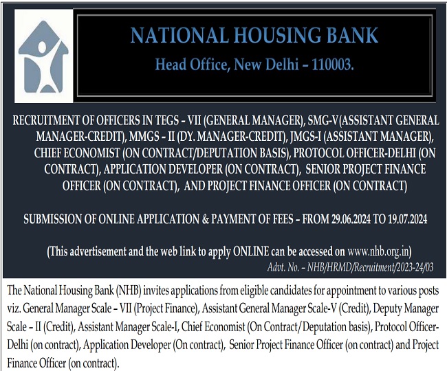 नेशनल हाउसिंग बैंक (NHB) की ओर से विभिन्न पदों पर भर्ती निकाली गई है जिसके लिए एप्लीकेशन प्रॉसेस शुरू हो चुकी है। बैंक में जॉब पाने का सपना देख रहे अभ्यर्थी इस भर्ती में शामिल होने के लिए 19 जुलाई 2024 तक फॉर्म भर सकते हैं। एप्लीकेशन फॉर्म nhb.org.in पर जाकर भरा जा सकता है। आवेदन से पहले अभ्यर्थी पात्रता एवं मापदंड की जांच अवश्य कर लें