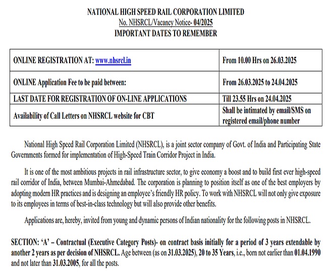 जॉब डेस्क, नई दिल्ली। नेशनल हाई स्पीड रेल कॉर्पोरेशन लिमिटेड (NHSRCL) की ओर से मैनेजर पदों पर भर्ती निकाली गई है। इस भर्ती के लिए एप्लीकेशन प्रॉसेस स्टार्ट हो चुकी है जो निर्धारित अंतिम तिथि 24 अप्रैल 2025 तक जारी रहेगी। जो भी उम्मीदवार भर्ती के लिए पात्रता पूरी करते हैं और रेलवे में सरकारी नौकरी पाना चाहते हैं वे तय तिथियों के अंदर ऑनलाइन माध्यम से ऑफिशियल वेबसाइट www.nhsrcl.in पर जाकर आवेदन प्रक्रिया पूर्ण कर सकते हैं। फॉर्म भरने से पहले उम्मीदवार पात्रता की जांच अवश्य कर लें।