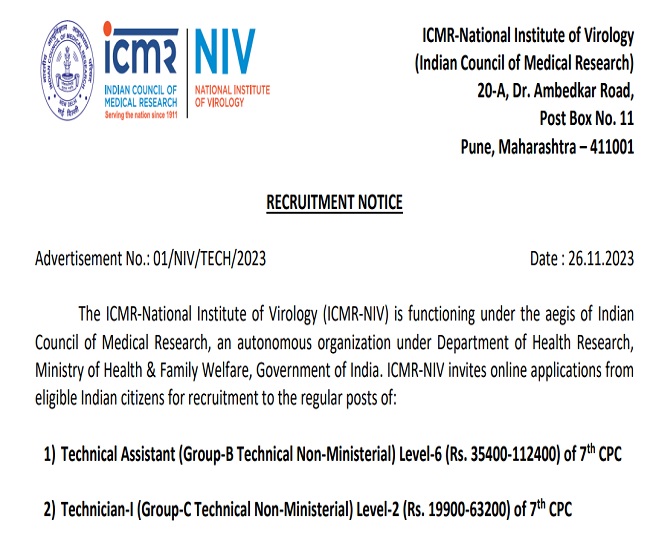 NIV Technical Assistant & Technician Recruitment 2023 Application Form Direct Link