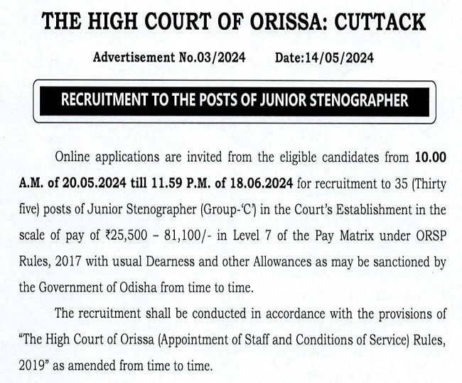ओडिशा हाई कोर्ट में जूनियर स्टेनोग्राफर के रिक्त पदों पर निकली भर्ती, इस डेट तक भर सकते हैं फॉर्म