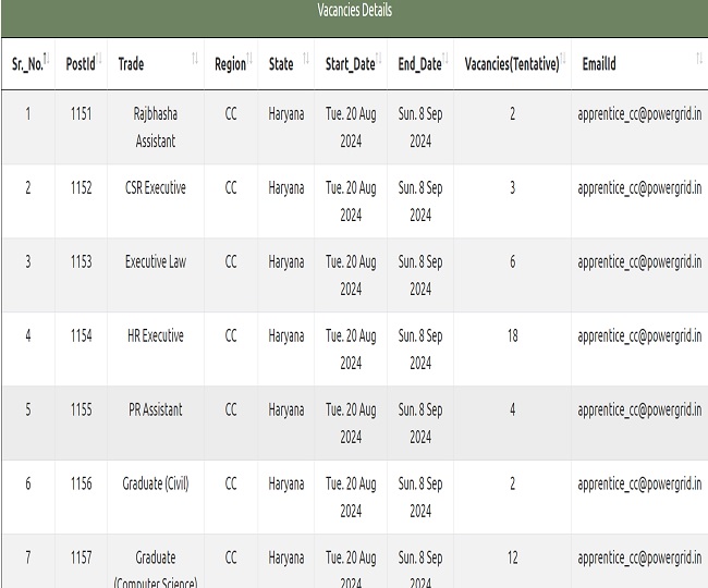 जॉब डेस्क, नई दिल्ली। पावर ग्रिड कॉर्पोरेशन ऑफ इंडिया लिमिटेड (PGCIL) की ओर से ट्रेड अप्रेंटिसशिप के बंपर पदों पर भर्ती निकाली गई है। अधिसूचना जारी होने के साथ ही इस भर्ती के लिए आवेदन प्रक्रिया 20 अगस्त से शुरू कर दी गई है जो निर्धारित अंतिम तिथि 8 सितंबर 2024 तक जारी रहेगी।
