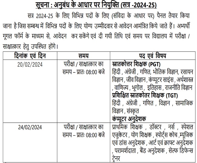 इसके अलावा प्राथमिक शिक्षक, डॉक्टर, नर्स, स्पेशल एजुकेटर, योग शिक्षक, स्पोर्ट्स कोच, म्यूजिक एवं डांस अनुदेशक, परामर्शदाता, बैंड अनुदेशक एवं सेल्फ डिफेन्स ट्रेनर के पदों के लिए इंटरव्यू का आयोजन 24 फरवरी 2024 को किया जाएगा।