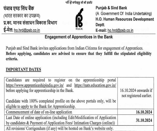पंजाब एंड सिंड बैंक में अप्रेंटिसशिप पदों पर शुरू हुए आवेदन, किसी भी स्ट्रीम से स्नातक उत्तीर्ण अभ्यर्थी कर सकते हैं अप्लाई