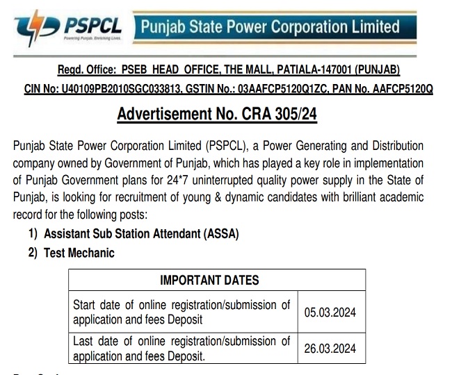 PSPCL Recruitment 2024: असिस्टेंट सब स्टेशन अटेंडेंट एवं मैकेनिक पदों पर आवेदन शुरू, 433 पदों के लिए 26 मार्च तक कर सकते हैं अप्लाई