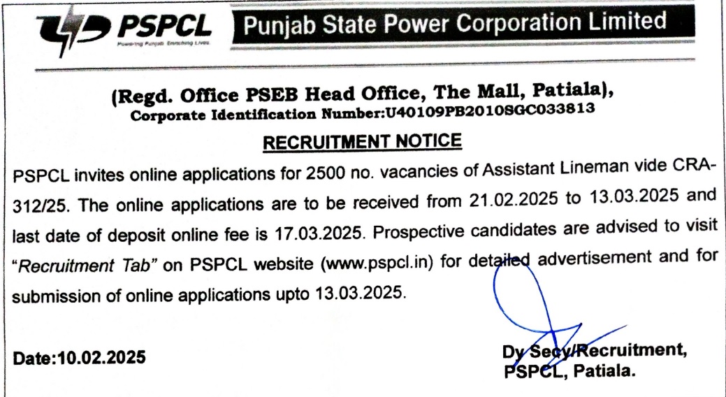 पंजाब स्टेट पावर कॉरपोरेशन लिमिटेड की ओर से असिस्टेंट लाइनमैन के 2500 पदों पर भर्ती निकाली गई है। इस भर्ती के लिए आवेदन प्रक्रिया 21 फरवरी से शुरू होकर 13 मार्च 2025 तक जारी रहेगी। जो भी अभ्यर्थी इस भर्ती के लिए पात्रता रखते हैं वे तय तिथियों के अंदर ऑनलाइन माध्यम से फॉर्म भर सकेंगे अन्य किसी भी प्रकार से फॉर्म स्वीकार नहीं किये जाएंगे।