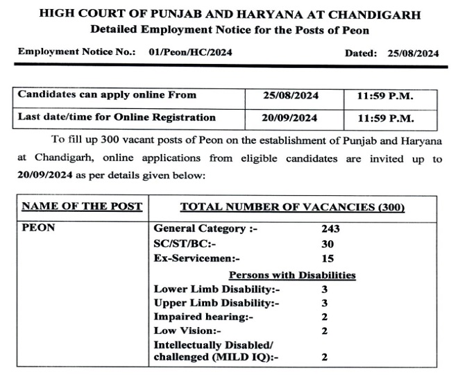पंजाब एवं हरियाणा हाई कोर्ट में चपरासी के 300 पदों पर भर्ती निकाली गई है। इस भर्ती में शामिल होने के लिए अभ्यर्थी 20 सितंबर 2024 तक आवेदन प्रक्रिया पूर्ण कर सकते हैं। आवेदन के लिए अभ्यर्थी का 10+2 उत्तीर्ण होना आवश्यक है। इस भर्ती में चयनित होने के लिए उम्मीदवारों को लिखित परीक्षा एवं फिजिकल एन्ड्योरेंस टेस्ट से होकर गुजरना होगा।