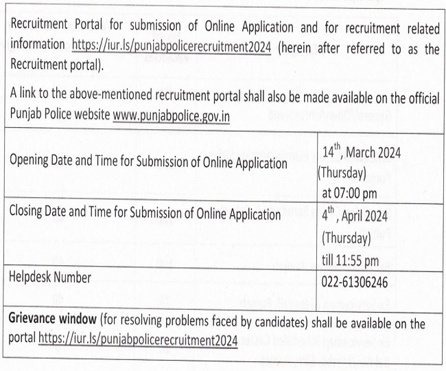 पंजाब पुलिस विभाग की ओर से जिला पुलिस कैडर के 970 और सशस्त्र पुलिस कैडर के 776 रिक्त पदों के लिए आवेदन प्रक्रिया आज यानी 14 मार्च 2024 से शुरू कर दी है जो निर्धारित अंतिम तिथि 1 अप्रैल 2024 तक जारी रहेगी। जो भी उम्मीदवार 12th उत्तीर्ण हैं और इस भर्ती में भाग लेना चाहते हैं वे तय तिथियों में ऑनलाइन माध्यम से आवेदन प्रक्रिया पूर्ण कर सकते हैं।