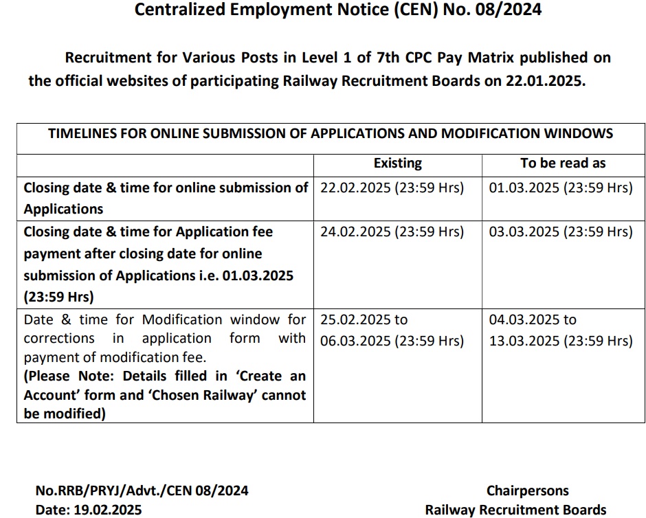 आरआरबी की ओर से RRB Group D Vacancy 2025 के लिए आवेदन की लास्ट डेट को 1 मार्च 2025 तक एक्सटेंड कर दिया गया है। ऐसे में जो अभ्यर्थी अभी तक फॉर्म नहीं भर सके थे वे अब बिना हड़बड़ी दिखाए आराम से आवेदन कर सकते हैं। आवेदन के बाद फीस 3 मार्च तक एवं फॉर्म में संशोधन 4 से 13 मार्च 2025 तक किया जा सकेगा।