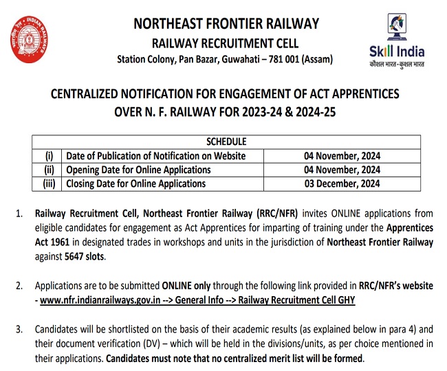Railway Recruitment 2024: नॉर्दर्न फ्रंटियर रेलवे में सरकारी नौकरी पाने का सुनहरा मौका, 5647 पदों के लिए 3 दिसंबर तक कर सकते हैं अप्लाई