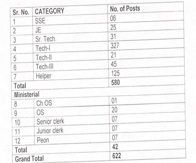 इस भर्ती के माध्यम से कुल 622 रिक्त पदों पर नियुक्तियां की जाएंगी। पदानुसार भर्ती विवरण निम्नलिखित है-