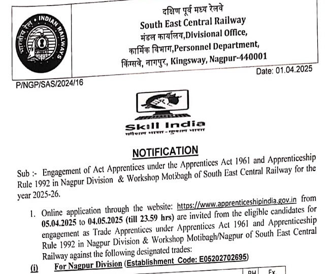जॉब डेस्क, नई दिल्ली। साउथ ईस्ट सेंट्रल रेलवे (SECR) की ओर से आरआरसी नागपुर डिवीजन में अप्रेंटिस पदों पर भर्ती निकाली गई है। इस भर्ती के लिए एप्लीकेशन प्रॉसेस 5 अप्रैल 2025 से शुरू हो चुकी है जो निर्धारित अंतिम तिथि 4 मई 2025 तक जारी रहेगी। जो भी अभ्यर्थी रेलवे में सरकारी नौकरी की तलाश में हैं वे तय तिथियों के अंदर अप्रेंटिसशिप पोर्टल apprenticeshipindia.gov.in पर जाकर रजिस्ट्रेशन कर सकते हैं। इसके साथ ही आप इस पेज पर उपलब्ध करवाए गए डायरेक्ट लिंक से भी आवेदन प्रक्रिया पूर्ण कर सकते हैं।