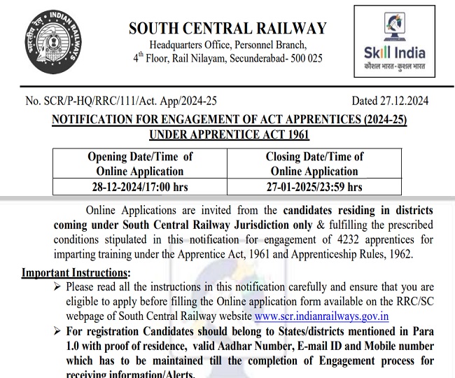 - SCR Railway Apprentice 2024 Online Form डायरेक्ट लिंक