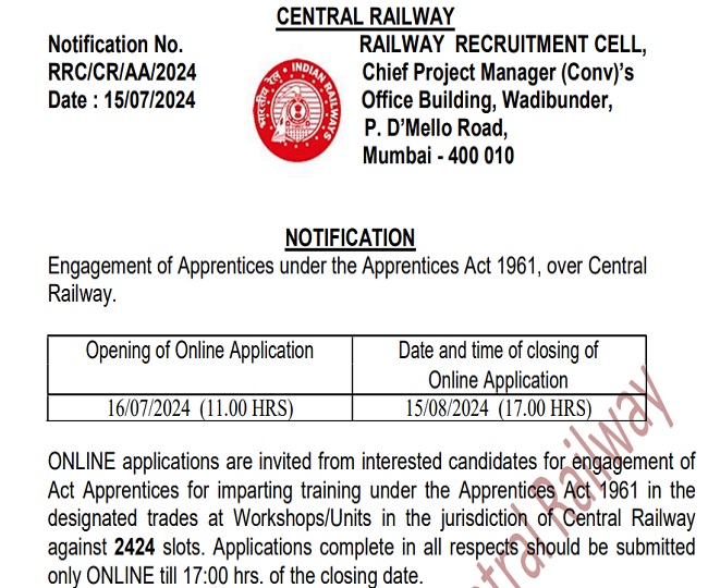 जॉब डेस्क, नई दिल्ली। रेलवे में सरकारी नौकरी पाने के इच्छुक युवाओं के लिए खुशखबरी है। रेलवे रिक्रूटमेंट सेल सेन्ट्रल रेलवे (RRC CR) की ओर से अप्रेंटिसशिप के बंपर पदों पर भर्ती निकाली गई है। आरआरसी सीआर की ओर से भर्ती के लिए अधिसूचना जारी कर आवेदन प्रक्रिया आज से शुरू कर दी जाएगी जो 15 अगस्त 2024 शाम 5 बजे तक जारी रहेगी।