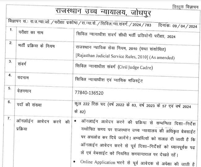 RHC Recruitment 2024: राजस्थान उच्च न्यायालय कर रहा है 222 सिविल जज की भर्ती, ऑनलाइन करें आवेदन 8 मई तक
