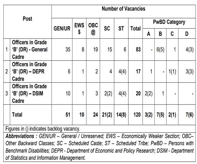 आपको बता दें कि इस भर्ती के माध्यम से 120 पदों पर भर्ती की जाएगी। इसमें से पदानुसार ऑफिसर ग्रेड B General के लिए 83 पद, ऑफिसर ग्रेड B DEPR के लिए 17 पद और ऑफिसर ग्रेड B DSIM के लिए 20 पद आरक्षित हैं।