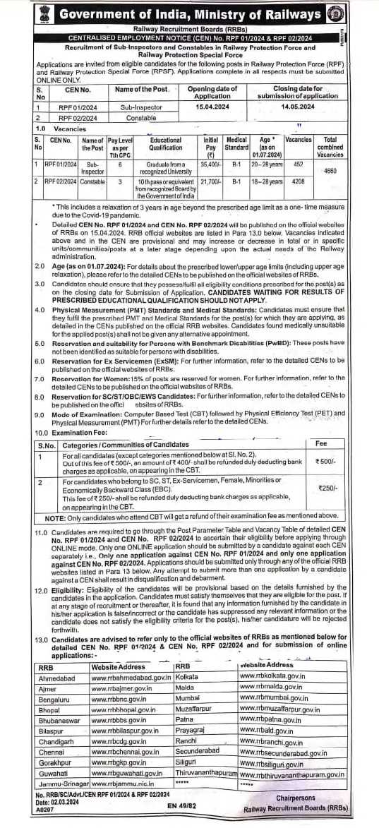 RPF Recruitment 2024: रेलवे सुरक्षा बल में निकली बंपर भर्ती, 4660 कॉन्स्टेबल एवं SI के पदों के लिए अधिसूचना जारी