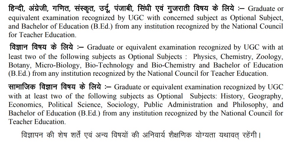 सीनियर टीचर पदों पर आवेदन के लिए अभ्यर्थी का संबंधित विषय से ग्रेजुएशन एवं बीएड उत्तीर्ण होना अनिवार्य है। इसके साथ ही उम्मीदार की न्यूनतम आयु 18 वर्ष एवं अधिकतम आयु 40 साल से ज्यादा नहीं होनी चाहिए। हालांकि, आरक्षित वर्ग से आने वाले उम्मीदवारों को नियमानुसार छूट दी जाएगी। आयु की गणना 1 जनवरी 2026 को ध्यान में रखकर की जाएगी। पदानुसार योग्यता के लिए अभ्यर्थी ऑफिशियल नोटिफिकेशन का अवलोकन अवश्य कर लें।
