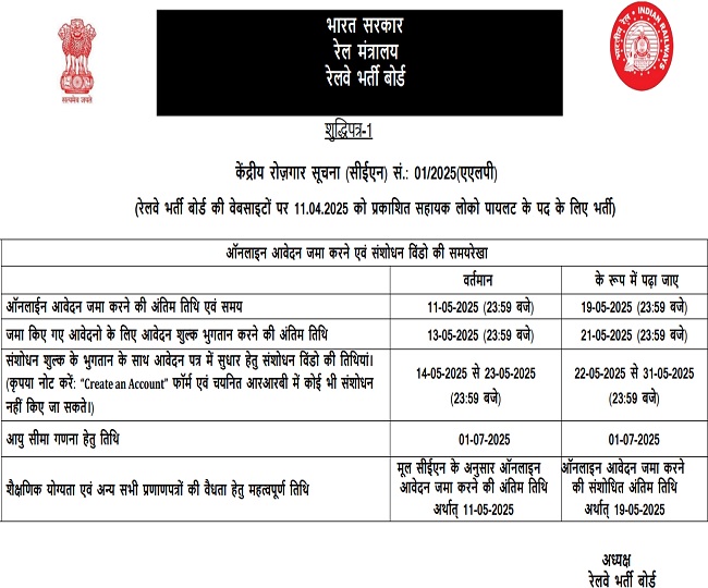 जॉब डेस्क, नई दिल्ली। रेलवे रिक्रूटमेंट बोर्ड (RRB) की ओर से असिस्टेंट लोको पायलट भर्ती (RRB ALP Recruitment 2025) के लिए आवेदन की अंतिम तिथि 11 मई निर्धारित थी जिसे अब 19 मई 2025 तक एक्सटेंड कर दिया गया है। ऐसे में जो अभ्यर्थी इस भर्ती में शामिल होना चाहते हैं और अभी तक किसी कारणवश फॉर्म नहीं भर सके हैं वे जल्द से जल्द फॉर्म भर लें।