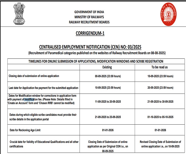 RRB Paramedical Recruitment 2025: आरआरबी पैरामेडिकल भर्ती लिए एप्लीकेशन डेट एक्सटेंड, अब 18 सितंबर तक रजिस्ट्रेशन का मौका