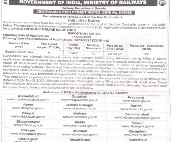 RRB Section Controller Recruitment 2025: रेलवे में एक और भर्ती का एलान, सेक्शन कंट्रोलर पदों पर आवेदन 15 सितंबर से