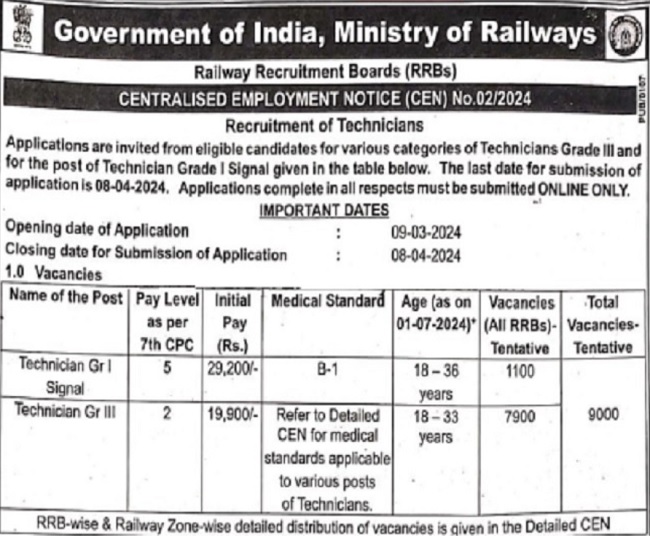 - यह भर्ती टेक्नीशियन ग्रेड 1 सिग्नल के 1100 पदों और टेक्नीशियन ग्रेड 3 के 7900 रिक्त पदों पर होगी।