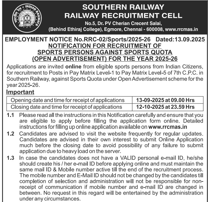 RRC SR Recruitment 2025: साउदर्न रेलवे में स्पोर्ट्स कोटा के तहत निकली भर्ती, 12 अक्टूबर तक आवेदन का मौका
