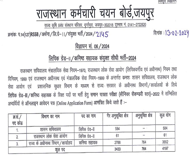 इस भर्ती के माध्यम से RSMSSB की ओर से कुल 4197 रिक्त पदों पर नियुक्तियां की जाएंगी। इसमें से जूनियर असिस्टेंट के लिए 3552 पद और लोअर डिविजन क्लर्क के लिए 645 पद आरक्षित हैं।